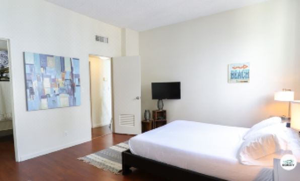 The spacious master bedroom boasts a queen-sized bed, cozy bedside lamps, a small TV, and plenty of closet space. The newly renovated bathroom features sleek finishes, a glass shower, and complimentary towels and a hairdryer for your convenience.