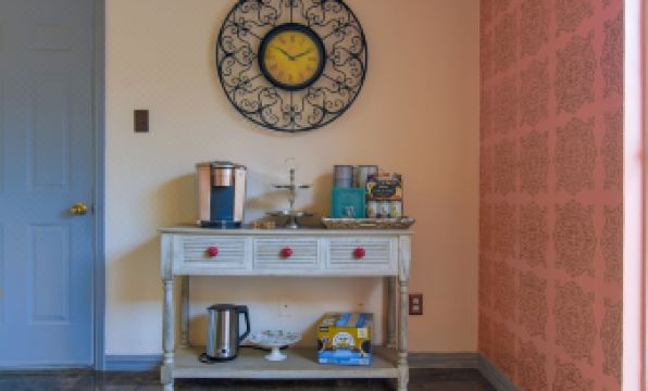 The coffee bar has a Keurig K-Elite coffee maker and K-pods are provided along with a variety of tea for your enjoyment.