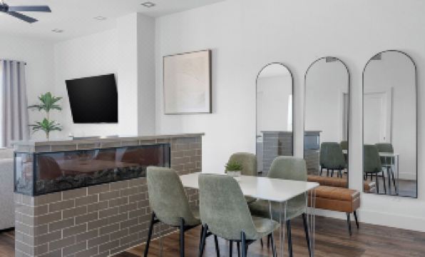Open Floor Plan: A spacious living room with a large TV and a cozy electric fireplace. Perfect for game nights or relaxing after a day at the stadium.