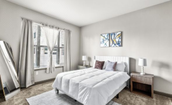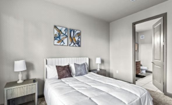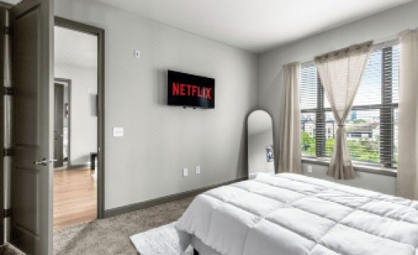 Relax in a cozy living area featuring a 55” smart TV and curated minimalist furnishings while overseeing the city. Each bedroom includes a plush queen bed and a 50” smart TV for your personal comfort.