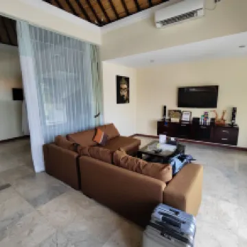 We booked this villa last minute and were travelling with our 2 teenage sons. The villa actually sleeps 8-10 people, it was absolutely massive and the pool was huge too. Full size kitchen with every amenity you could possibly want plus a massive lounge room and dining room that could easily sit 10 people. The bathrooms were spacious and clean and our host Agus was an absolute delight. Nothing was too much trouble. Our breakfast was brought to our dining room with two attendants on call to not only serve us the breakfast but wash up everything afterwards. We felt like royalty! The villa is well located with plenty of off street parking. The beautiful Body Works Spa is a mere 7 minute walk down the road. We will definitely be back, great value for money.