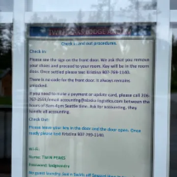 Twin Peaks lodge is a gem of a place to stay while in Seward Alaska. The quaint lodging is in a unique house with a B&B feel (without the food). Great parking. Rooms are not fancy.. Our only concern was we did not understand that the kitchen area needs to be clean while off doing our thing. We were not introduced to the staff or caretaker.