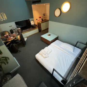 The location of the hotel is great, and the subway is just a five-minute walk away. The overall layout is similar to a loft. Below is the sofa TV and above is the bed. Very large space