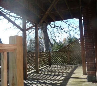 Wisteria covered trellis over back deck with summer furniture.