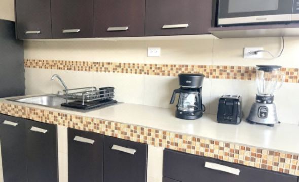 The kitchen has the essential basic accessories to be able to cook and it has some appliances such as coffee maker, toaster, blender, microwave, stove.