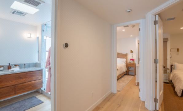 The two bedrooms share a bathroom, with a large Carrara Marble double vanity and Carrara Marble walk-in rain shower.