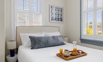 Two sunlit bedrooms, each with queen-sized beds, pay homage to European seaside resorts—perfect for early risers eager to explore the city.