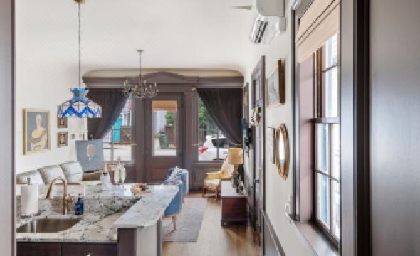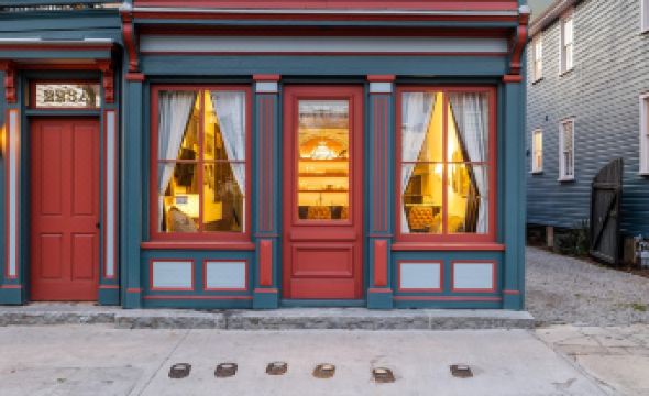As you walk into The Parlor house from the first floor piazza, you are greeted by an elegant entry foyer with the home’s open living room and kitchen to the right. The living room and kitchen area at the front of the home are the original building’s storefront and commercial space. The living room, adorned with classic yet comfortable furniture pieces, has plenty of space for your group to relax and take in the home’s history and vintage antique artwork. The first floor piazza can be accessed off the living room as well.