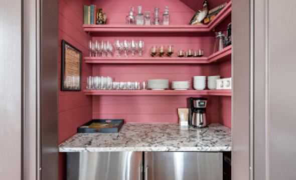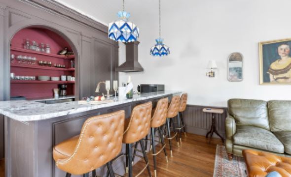 While The Parlor House has a classic vintage vibe, the kitchen is anything but that! An arched out-cove houses custom built-ins and a modern stainless steel wine cooler style fridge and freezer. A stainless steel oven and stove are also available for nights in with a home cooked meal. Sit at the large kitchen bar with seating for five, share a meal or an evening cocktail…or better yet both!