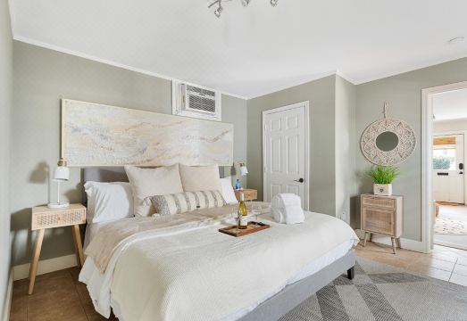 Retreat to the master bedroom, a serene sanctuary with a plush king-sized bed, ample storage, and an adjacent full bathroom featuring new fixtures and a relaxing bathtub/shower.