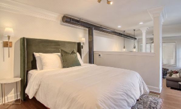 Inside, you'll find a blend of modern comfort and historic charm. The loft features an open-concept living area with high ceilings, exposed brick walls, and custom glass windows that fill the space with natural light. The fully equipped kitchen includes stainless steel appliances, custom butcher block countertops, and all the cookware you'll need for a cozy night in! The spacious bedroom offers a plush queen-sized bed with premium linens, while the bathroom boasts a luxurious walk-in shower and spa-quality amenities. Additional conveniences include high-speed Wi-Fi, a smart TV and in-unit laundry, perfect for the business traveler.About pets:No pets allowed.About children:Children allowed: ages 0-17.About smoking:Smoking is not permitted.About events:No events allowed.