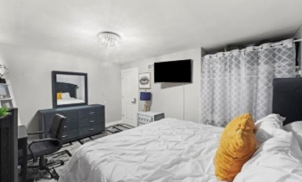 • Master Suite: King bed, Smart TV, large dresser, mirror, closet, and office desk