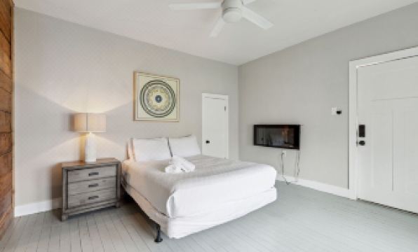 The bedroom offers a comfortable queen bed, soft linens, and closet space for your belongings.