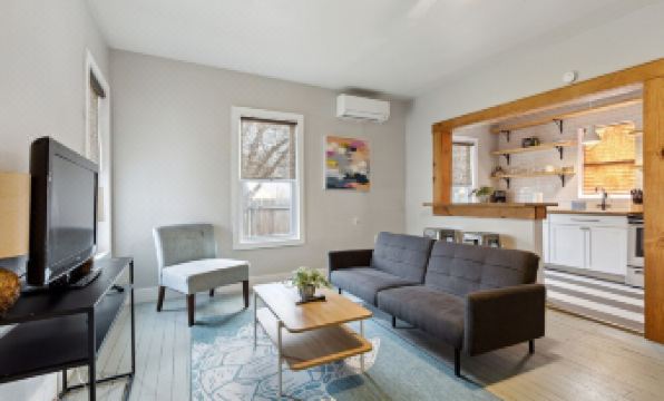 The space features a cozy living area, a fully equipped kitchen with essentials, and a comfortable bedroom with a queen bed. Stay connected with fast Wi-Fi and unwind in the shared patio and backyard.