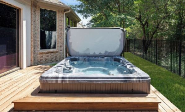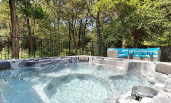 • A large deck with a private hot tub, backing on to a peaceful forest backdrop.