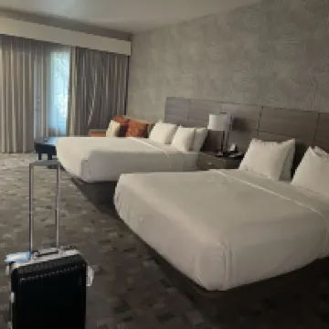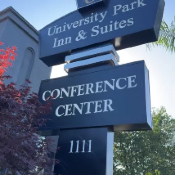 Nice and quiet with a beautiful garden setting. The staff was pleasant and very helpful. The room was neat, clean. The bed was very comfortable and the room was arranged conveniently. Close to the freeway, but quiet. Dog friendly, nice areas to walk the dog, close to the trail around the campus, dog fee was high.