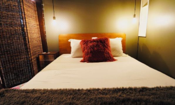 The sleeping nook is equipped with a Queen platform bed.