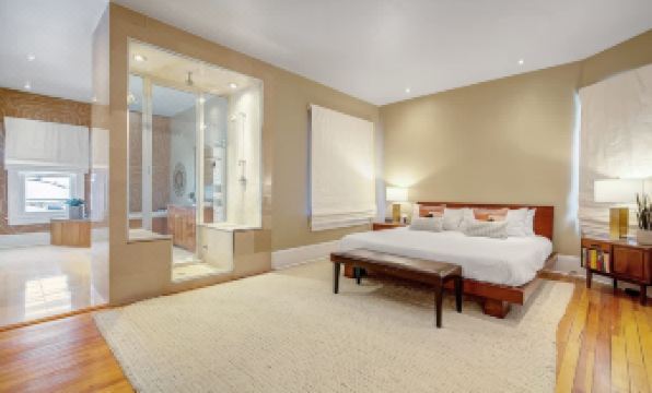 Amenities include two living areas with large flatscreen TVs (no cable - streaming apps only) and a steam shower in the master bathroom. The kitchen has a Sonos System and high-end appliances: Blendtec blender, Breville convection toaster oven, KitchenAid mixer, and stainless steel kettle. All paint is zero VOC, and mattresses are hypoallergenic and organic to relieve allergy sufferers.
