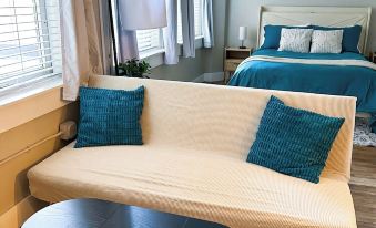 Queen-sized bed for restful sleep, and the bathroom features a full tub/shower combo with stylish tile finishes and a bidet. The condo also includes Wi-Fi, all utilities, and complimentary laundry facilities on the same floor. Stay active in the professional-grade gym located in the building.