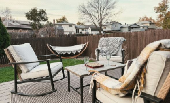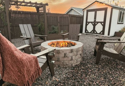- Gas Fire Pit + Aderondak Chairs w/ Cup Holders