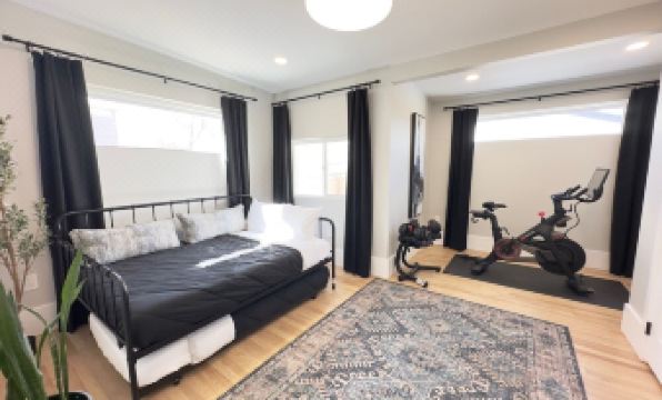 The 5th bedroom doubles as a state-of-the-art gym offering guests the choice between Bowflex adjustable dumbbells, Peloton Bike, or The Lululemon Studio Workout Mirror. There is a wide variety of virtual training options from strength training to yoga to HIIT to Pilates and more...