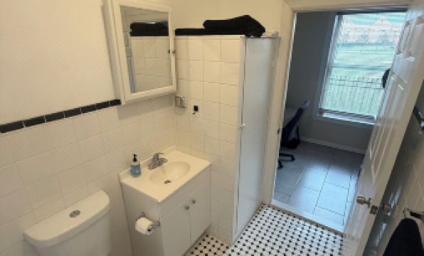 The apartment features a new European-style bathroom stocked with fresh towels and toiletries.