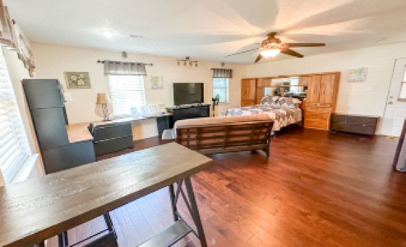 👑 Bedroom Area - Open concept contemporary studio with Comfortable King Bed – Get a restful night’s sleep, large dresser