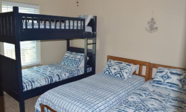 3 bedrooms: 1 bunk bed 2 single beds 1 queen bed and 1 king bed