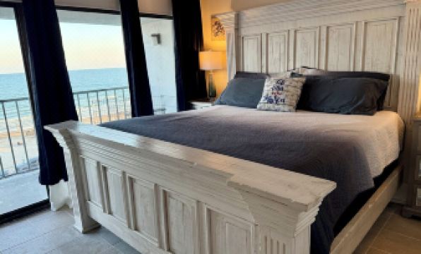 Wake up in the Oceanside Bedroom, featuring a king bed, nautical accents, and floor-to-ceiling windows with stunning Gulf views.