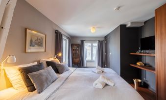 B&B très bien situé. Parking à 350m. Chambre beaucoup plus sombre que sur la photo, limite lugubre dans ses tons gris foncés et marron. On a envie de lumière, de tons doux. Le Rez de chaussée est superbe avec ses carreaux de ciment. Dommage qu’il y ait beaucoup de poussière sous le lit et les meubles de la chambre. La literie est bonne ce qui est positif Côté accueil, peut mieux faire… je pense que le business prime sur le reste