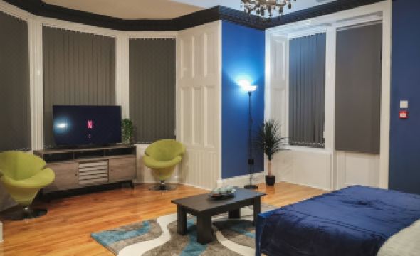 Very spacious clean studio apartment, convenient location with free on street parking. Lovely warm foyer. Very attentive host. Will definitely be a returning customer for future Glasgow adventures. Within a £10 Uber ride of centre of city.