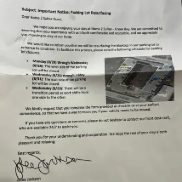 Disappointed in this hotel. Breakfast was not good. Overall cleanliness was not good. Major issue is that they were doing paving sealer the week I was here, leaving half of the parking lot closed, resulting in major parking issues. They were supposed to be done Friday, but it is now Sunday morning on the Labor Day holiday weekend, and it is still closed, and no information from Ms Jolee Jackson as to when it would be open again. Sorry, Ms Jackson, I would not stay at this hotel again.