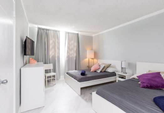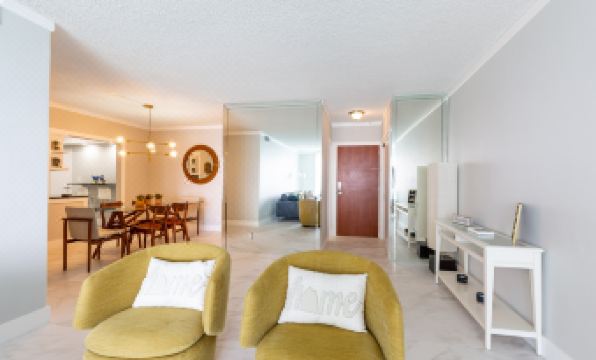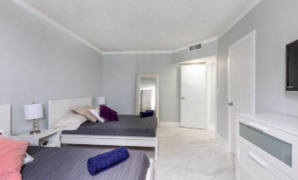 This 2 Bedroom modern condo suite includes a large balcony, with breathtaking views of the Atlantic Ocean from the 11th floor. It comfortably accommodates 6 people, with 2 bedrooms and 1.5 Bathrooms. The 1st Bedroom has 2 Queen size beds and 1 King size bed in the Master bedroom. 1.5 newly updated bathrooms include toiletries, hairdryer, scale and towels. Open and airy with gorgeous white sparkling porcelain tile floors throughout, a modern living room with sectional sofa and flat-screen TV, dining room that seats 6 and a beautiful newly renovated fully equipped Kitchen with stainless steel appliances – including a full-size refrigerator, microwave, dishwasher, stovetop/oven, and stocked with everything you need - utensils, plates, cups, cooking pots and pans, toaster, electric kettle, coffee machine, etc. to give you all the comforts of home! The washer and Dryer are shared by the entire floor.
