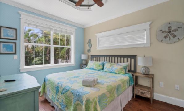 The fully equipped kitchen is sure to help satisfy every craving and will make any level chef happy. It features stainless steel appliances, broad countertops, and island seating, ideal for eating a quick snack and entertaining the cook. In addition to the two tables in the living area, there is an outdoor table for guests to enjoy their meals while delighting in the tropical island breeze.