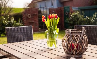 Our holiday home on the North Sea coast in Hooksiel - consisting of 3 halves - is located in an old settlement just behind the old dike near the historic center. It can be reached on foot in 5 minutes. The beach is about 1.5 km on foot or by bike.