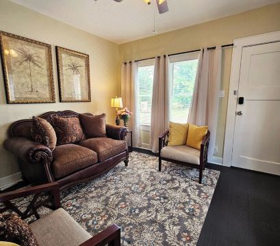 Plenty of natural light surrounds this serene romantic space. Comfortable sofa and small bar area in living room to relax. Georgeous european style crowned queen-sized bed with a unique style side table, sitting space, mirrors, and more. Small closet in bedroom to accommodate your belongings. Both, living room and bedroom, with 43 inch smart TVs and other free Roku channels. Full kitchen with granite counter tops and many essentials to stay in and have a romantic home cook dinner. Small office corner space with wifi. The outdoor patio is fenced and has acces to a private driveway where you can safely park your vehicle. Outdoor table with chairs, umbrella and a grill provided to spend some time outdoors. Book today & experience this georgeous, serene, romantic & stylish Erupean decorated space at Europa.