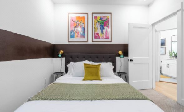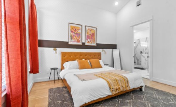 ⬧ Master bedroom: King bed, en suite bathroom, and dedicated workspace
