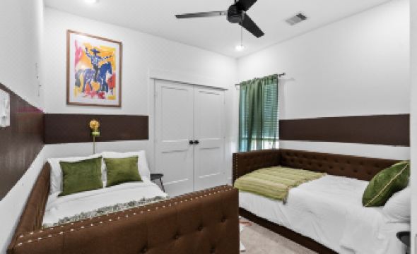 ⬧ Bedroom 3: Sleeps 3 guests and includes a ceiling fan