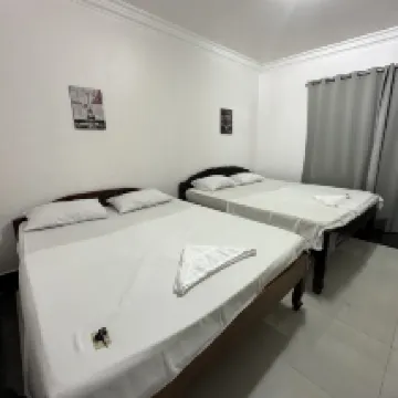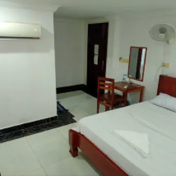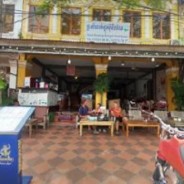This convenient hotel in the heart of Kampot is close to everything, and the view is stunning. On the ground floor, there's a bar with a few tables outside, offering a stunning view of the river. Nearby are the singing fountains and a fountain with a horse. If you exit the hotel to the right and take the first right turn, walk about a minute to the departure point for buses to Sihanoukville. You can buy bus tickets right at the hotel, and you can rent a motorcycle or bicycle. The beach by the river is a two-minute walk away, and the view is stunning at any time of day. In the evening, there's music playing in the café.