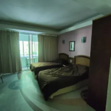 The hotel definitely needs a renovation; the toilet in my room broke twice. The shampoo dispenser in the shower wasn't working. And of course, the actual room upon check-in didn't match the photos – everything looked much nicer in the pictures. They provided a kettle upon request, and cleaning was done daily. However, the furniture is outdated and the chairs are rusty. In short, they should really consider renovating the hotel. The pool is not bad. Across from the hotel, there's a decent cafe with tasty and inexpensive food, though 'inexpensive' is relative, as it is everywhere. There's also a store nearby where you can pay with an RSHB card.