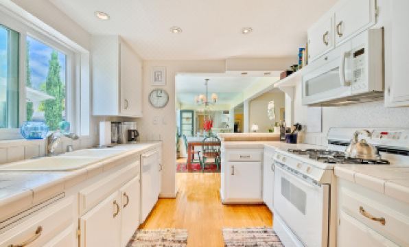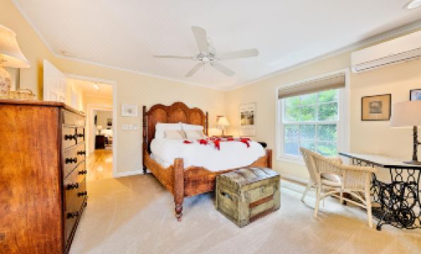This spacious home that sleeps six (6) in beds comfortably is also a great option for anyone who wishes to spend the winter months in a warmer climate in a beautiful seaside community. Walk up the serene, tree-lined brick sidewalk of this home and when you open the door you will find yourself in a sunny great room with lots of large windows, making it feel light, bright, and airy. The living room area has lots of comfortable cluster seating from which everyone can watch the large flat screen TV. A ceiling fan, for your comfort, is also a wonderful extra. Next to the living room is a desk space for remote working and a 4-seat dining table with a kitchen breakfast bar for two. The nearby kitchen that has everything you need to satisfy your culinary desires, just add the food and camaraderie and have fun.
