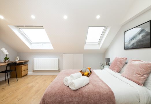 The Master bedroom features beautiful skylights, a double bed, bedside tables with lamps, a wardrobe, desk with chair and more. All bedding and linens are provided, and you’ll find the beds neatly made on arrival. There is an en-suite bathroom with a walk-in shower, sink, heated towel rail and toilet. Complementary toilet rolls, shampoos, shower gels, hand soap and a hair dryer will be provided to start off your stay. Luxurious bath towels are provided for 8 people. The other three bedrooms feature double beds. There is a second en-suite bathroom with a shower, toilet and sink. The third bathroom features a combination bathtub/shower, toilet and sink.