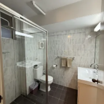 We booked a family room for an overnight stay, spacious room with double bed and 2 singles. Coffee making facilities, fridge, microwave, plates are available in the room. Bathroom is clean and toiletries are supplied, the shower screen need some sort of re-sealing as some water comes out of it after shower. Location is just 5 minutes drive or 10-15 min walk to the shops and restaurants. Staff are exceptionally friendly and helpful. The place was good for what we needed.