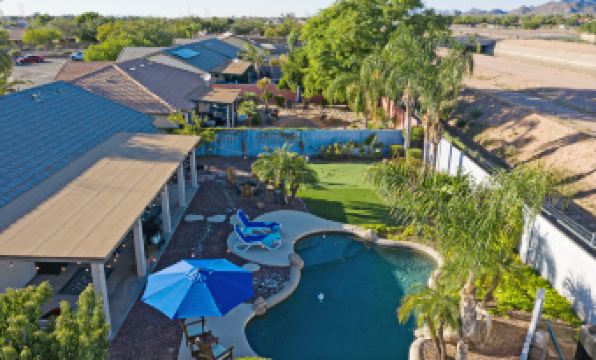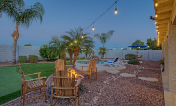 Beautiful and comfortable, CAROL'S KEEPSAKE, our 3 BR, 2 BA, one story home is the ultimate vacation retreat with many appealing bonuses and truly amazing ambiance. The backyard provides an exciting private oasis with amenities that include a pool with optional heating, propane fire pit, putting green and a covered patio with a gas grill, dining furniture, TV and corn hole game. Guests can help themselves to the seasonal fruit on our pretty citrus trees. The Superstition Mountains in the distance enhance the overall picturesque setting.