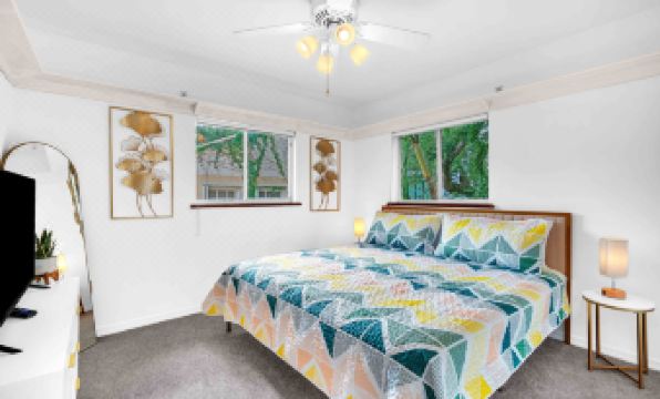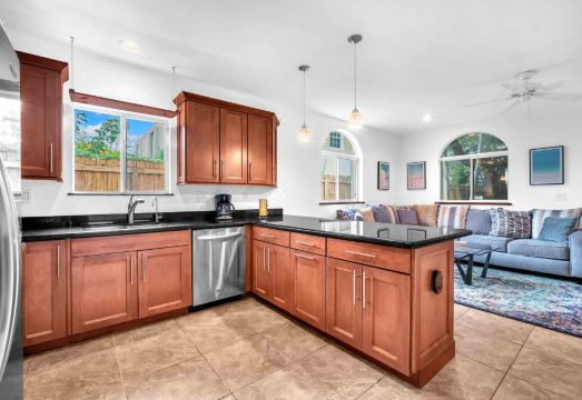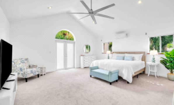 Uniquely designed interior and very spacious. The bedrooms are all on the 2nd floor and are 3 king beds, 2.5 bathrooms and 2 pull out sofas downstairs in living room. Grove House features a delightful, fully equipped kitchen great for entertaining. Enjoy a charming backyard and a generously spacious master bedroom boasting its own balcony with sun chairs - perfect for relaxation and basking in the sun. Washer/dryer and a gate for security. Fit up to 2 cars in parking area.