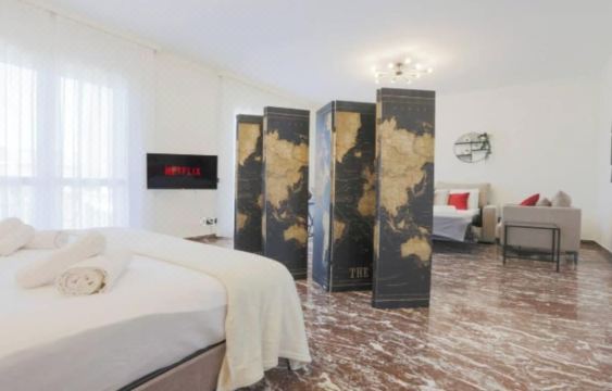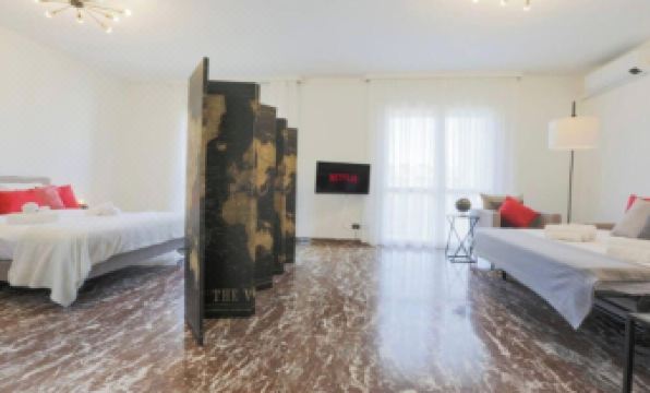 The spacious living area is thoughtfully divided into two sections. On one side, a cozy sleeping nook features a plush double bed (160x200 cm) and stylish hangers for your belongings. On the other, the relaxation zone invites you to unwind with a comfortable sofa bed, two armchairs, and a 32-inch Smart TV. Step out onto the private balcony to take in the stunning views of Milan Central Station. Cook up your favorite meals in the modern kitchen, complete with a refrigerator, freezer, dishwasher, oven, stove, and Nespresso coffee machine (pods included). A sleek glass dining table seats up to 8, making it ideal for shared meals or casual gatherings.