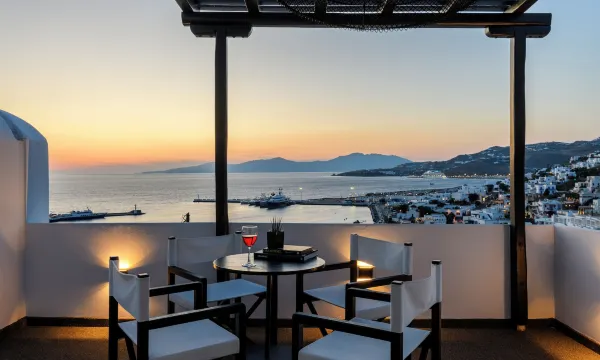 Location: Central proximity to Mykonos Town, Old Port, and key attractions , with panoramic views of the harbor and sunset.