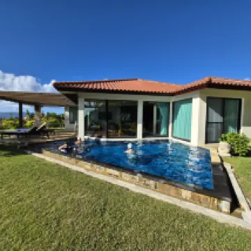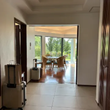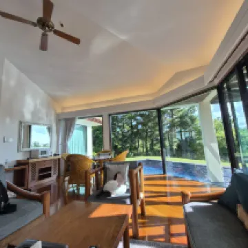 I stayed at the deluxe cottage of the clubhouse lodge as a place to stay during my trip, without playing golf. It seems to be standard to stay before or after playing golf, but I wanted to stay in a villa instead of a hotel, so I stayed here for the first time. It's less than 90 minutes by highway from the airport. There are no supermarkets nearby, so you have to get food and drinks in Naha or go to Nago. There is a convenience store within a 5-10 minute drive. There are no restaurants within walking distance, so it's a 5-10 minute taxi ride to the national highway where there are several. Check-in and check-out are done at the reception desk of the golf course clubhouse, but there is no shuttle service to the cottage, so you have to walk or drive there, which is inconvenient. The breakfast restaurant is also located inside the golf course clubhouse, so it's a hassle to get there. The building was a little old, but the bathrooms were renovated and clean. It was well-cleaned, except for some outdoor showers. The cottage has two twin bedrooms, and each is equipped with a bath, toilet, and sink, so it's easy to use. The shower booth and bathtub were separate, and the toilet with washlet was also partitioned, which was good. The main living room had a dining set, sofa, low table, microwave, refrigerator, electric kettle, disposable slippers, tea, coffee, mineral water, etc. There was a small private pool outdoors, but there were many small insects and beetles floating in it during the season, so I didn't feel like going in. There was a barbecue space outdoors, but it had no roof, so you couldn't use it in rainy weather. I rented a barbecue grill, but when I inquired in advance, I was told that it was 8,000 yen for the duration of my stay, but when I got there, I was told that it was 8,000 yen per night, so I stayed for two nights and returned it after one night. 8,000 yen per night is very expensive. The most disappointing and inconvenient thing was that there was no kitchen or sink in the cottage. It seems that the premium cottages have a kitchen. Furthermore, although there is a barbecue grill for rental, there are no knives, cutting boards, or cooking utensils for rental. I had no choice but to go to Nago city and buy them at a 100 yen shop. All that is provided is paper plates, disposable chopsticks, salt, pepper, and oil. You can also order food, but I didn't do that because it's not cost-effective. There are a lot of beetles and small insects at the barbecue, so people who don't like insects should be careful. The staff's attitude is average. The staff specialize in golf course reception, so they should learn how to receive and serve customers in the hotel industry.