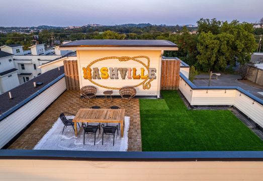 Rooftop deck (4th floor) with Nashville Mural, Outdoor Seating/Dining, and City Skyline. The living area (2nd floor) is a bright living space with SMART Flat Screen TV and designer furnishings. Kitchen (2nd floor) offers guests a fully equipped kitchen with stainless steel appliances as well as breakfast bar seating. Shared (2nd floor) hallway has a full bathroom.
