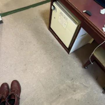 The carpet on the floor of the room is full of stains and cigarette burns.